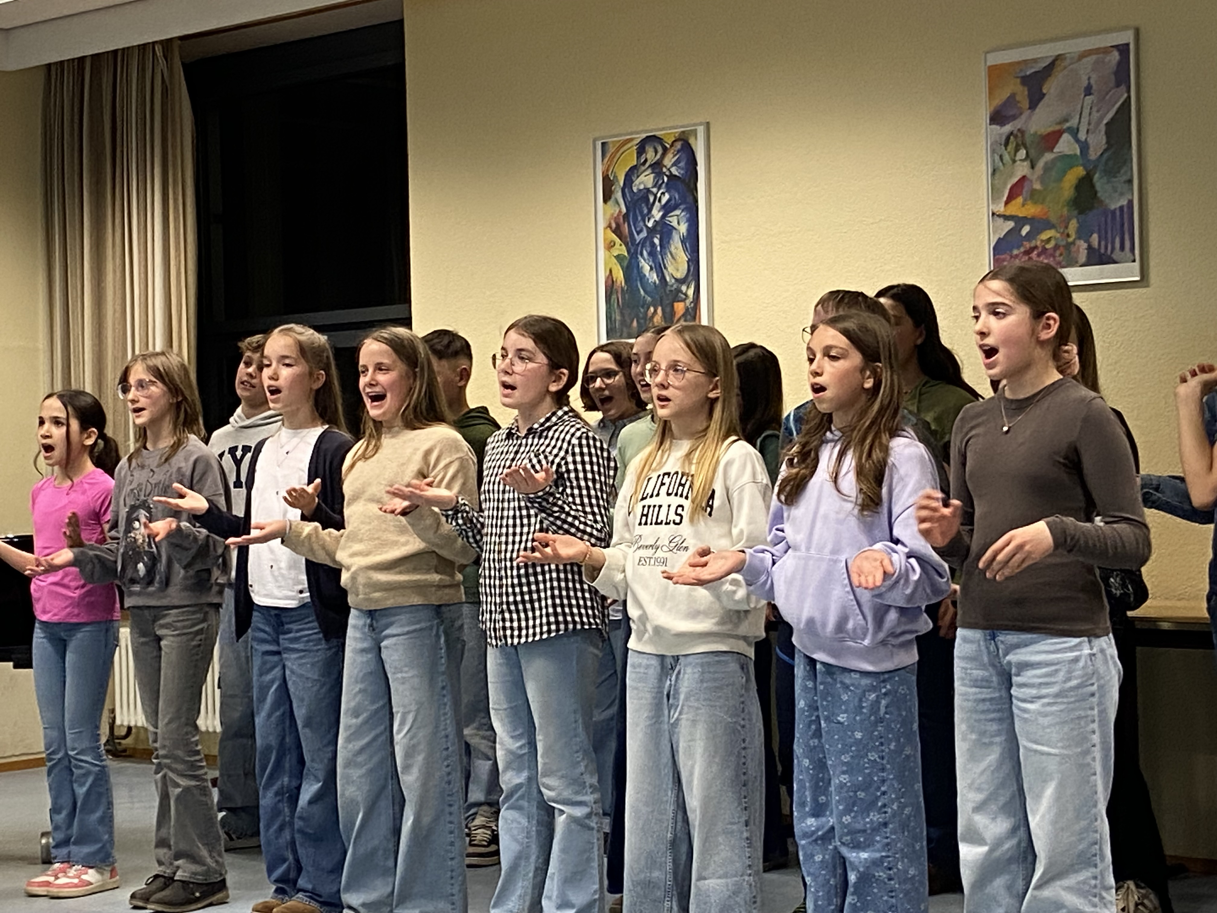 Die Klasse 6c veranstaltete am 25.03.2026 unter der Leitung ihrer Lehrer Herr Kleinbub und Frau Rönsch einen musikalisch-literarischen Abend im Musiksaal des ASG. Viele Familien und Lehrer warteten gespannt und gut gelaunt auf das Programm, für das die Klasse fleißig Lieder geprobt und mit großem Einsatz Gedichte einstudiert hatte. Kurz nach 19 Uhr war es dann endlich soweit: Emely und Valentin begrüßten die Gäste und kündigten einen abwechslungsreichen Abend an. Und sie sollten Recht behalten: Insgesamt wurden 20 Musikstücke aus dem Unterricht präsentiert, darunter viele Kanons und tolle Lieder, die manchmal auf dem Klavier begleitet wurden, aber auch Musizierstücke, die auf Xylophonen, Glockenspielen, Metallophonen, Bassxylophonen und – nicht zu vergessen – einer Conga gespielt wurden. Für manche Stücke hatte die Klasse sogar eine eigene Choreographie einstudiert. Waren viele vor ihrem Auftritt noch sehr aufgeregt, so stellten alle vor dem Publikum souverän ihr Können unter Beweis. Und es gab nicht nur Musiktalente zu bestaunen: Zwischen den Liedern trugen einzelne immer wieder Gedichte u.a. von Joachim Ringelnatz, Heinz Erhardt und Eduard Mörike vor, die das Publikum mit ihrem Witz zum Schmunzeln brachten. Das einstudierte Programm endete mit einem von der Klasse mit den Gästen gemeinsam gesungenen Kanon zu „Abendstille überall“ und mit Emelys und Valentins Schlussworten. Ein unvergessliches Highlight des Abends sollte jedoch noch mit dem spontanen Auftritt von Frau Biedermann folgen, die mit ihrer Interpretation von „We will rock you“ von Queen zum Rockstar wurde. Insgesamt war der musikalisch-literarische Abend ein voller Erfolg. Das Publikum war begeistert. Zur Erinnerung durfte sich jede Familie eine Tulpe mit nach Hause nehmen. Für die Klasse war es eine tolle Erfahrung, der Einsatz im Vorfeld hat sich allemal gelohnt.
