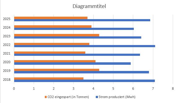 Im Jahr 2018 7,10 MWh Strom produziert und damit 3500 kg CO2 eingespart.